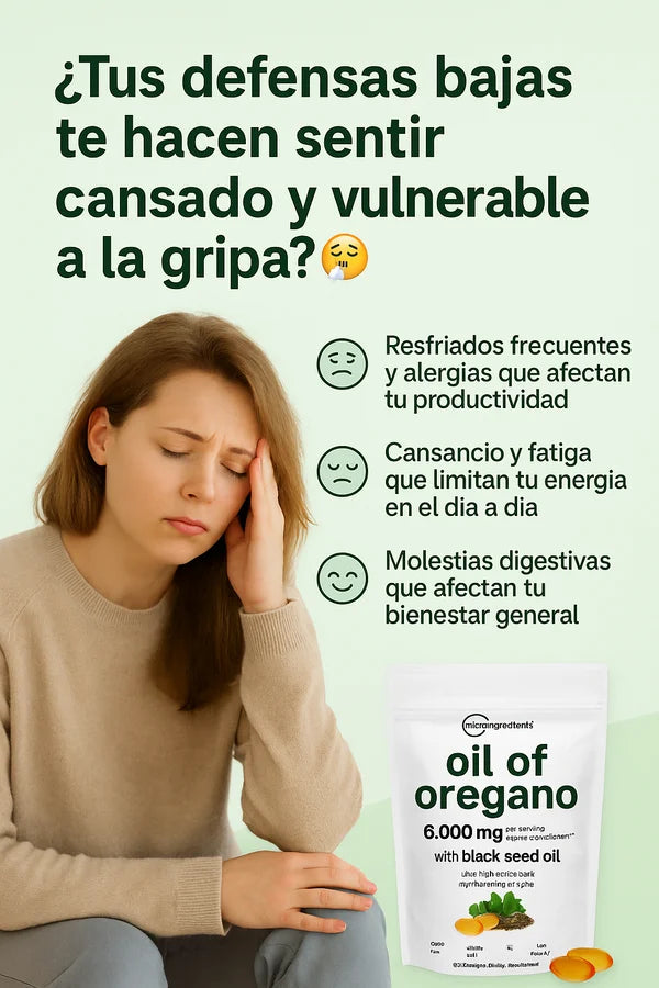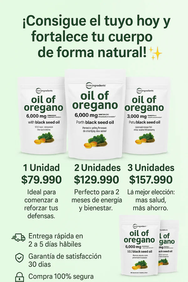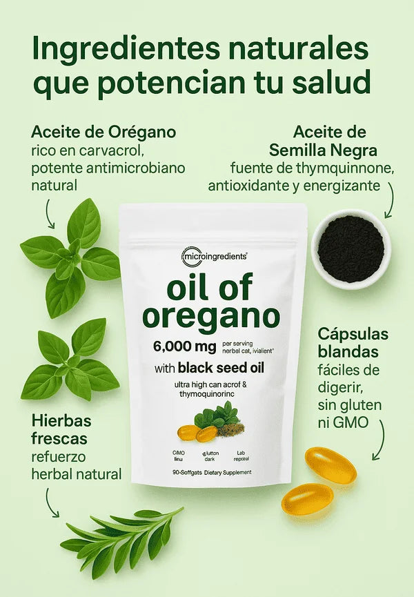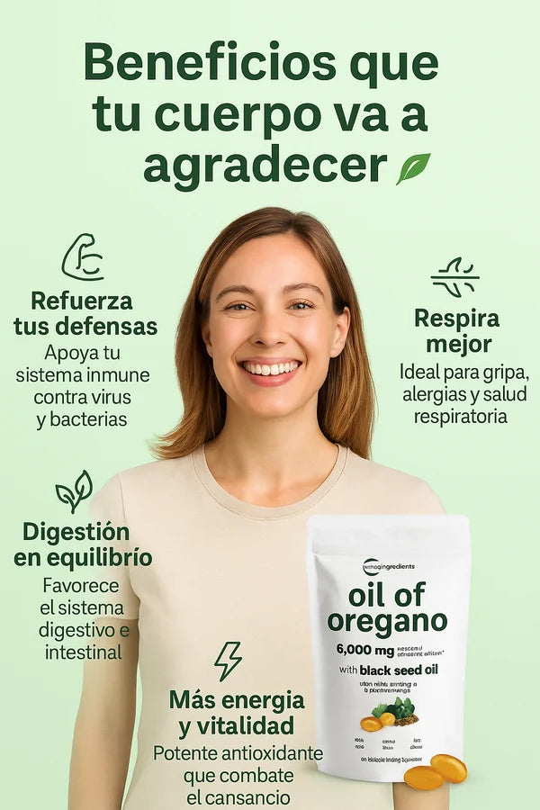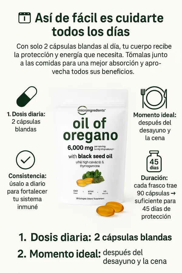 Este suplemento natural combina dos superingredientes —Aceite de Orégano y Aceite de Semilla Negra— para crear una barrera protectora contra virus, bacterias y hongos, mientras fortalece tu digestión, energía y bienestar general.